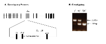 Genomic DNA was isolated from ES cells or mouse tissues by Wizard SV 96 Genomic DNA purification system (Promega Cat A2371). Genotyping PCR consisted of a 195bp product amplified from the wild-type (wt) allele using a forward primer A (CTGCCTTCCTAAGTTTCTTAG) in the wt sequence upstream of the cassette and a reverse primer B (GTGAAGACATTGCTATGGCAG) downstream of the cassette. A 350bp product was amplified from the targeted allele using primer B with forward primer X, within the selection cassette. After enzymatic amplification for 35 cycles (45 seconds at 94 °C, 45 seconds at 55 °C, and 1 minute at 72 °C), the PCR products were size-fractionated on a 1% agarose gel in 1x Tris borate-EDTA buffer.