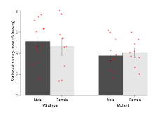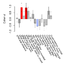 Mutant mice showed medium overall behavioural difference from wildtypes, with three of 16 behaviour variables significantly impacted in these mutant mice. In the elevated plus maze task, two behavioural variables of five were significantly impacted in mutants. In the rotarod task, one behavioural variable, RR memory, was significantly decreased in mutants. Open field/novel object exploration, fear learning, contextual memory and cued memory tasks were unaffected. Definitions of variables may be found below.