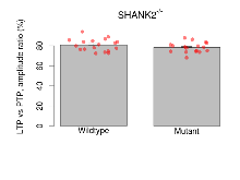 Variables shown are: LTP vs PTP, amplitude ratio, Reduction in potentiation from immediately after theta-burst stimulation to one hour later, fEPSP amplitude ratio. LTP based on amplitude, Long term potentiation, ratio of amplitudes of fEPSPs in test pathway and control pathway.