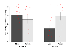 | Fear learning, trial effect | % freezing | 61.4 (4.5) | 50.7 (10.1) | 30.4 (8.1) | 58 (9.1) | 0.018 * | 0.076 |
