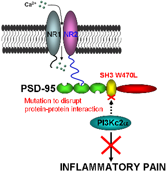 Mutation of the tryptophan 470 residue of PSD-95 to leucine in the polyproline binding site of the SH3 domain blocks interaction with PI3 kinase (Pik3c2α) and inflammatory pain.