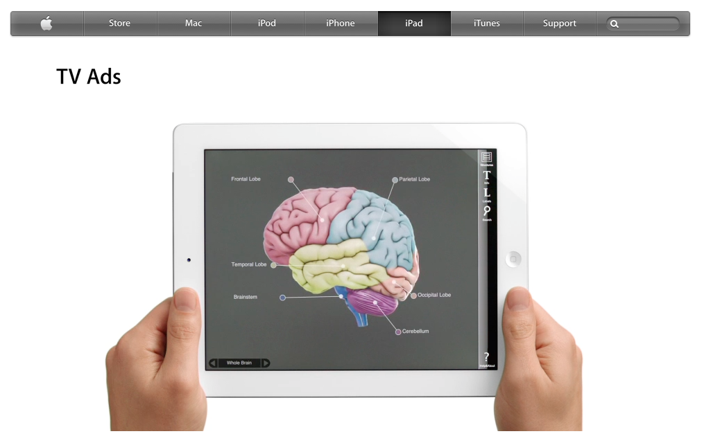 | 3D Brain App features in Apple advert | Genes to Cognition (G2C) Online 3D Brain App featured in Apple US nationwide advert (screenshot). | View |