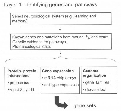 The entry point for the strategy (Layer 1) is molecular information derived from basic science studies. Strong emphasis is placed on the value of genetically modifiable organisms with nervous systems (invertebrates: fruit fly, Drosophila; worm, Caenorhabditis elegans; vertebrates: mouse, Mus musculus; zebra fish, Danio rerio). Through the use of genetic screens and mutations, these organisms have generated lists of proteins that are involved with various phenotypes. Compiling the set of genes that are involved in a common phenotype (e.g. learning) or involved in a multiprotein complex, or some other ways of classifying sets, produces useful information for a human genotyping study. A prototype for this set is that derived from the molecular studies of the multiprotein complexes (Hebbosomes) underlying acquisition of learning (10862698).