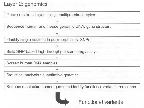 A major collaborative international effort is underway to identify SNP in the human genome. This SNP Consortium (10757651; 11029002) aims to generate sufficient numbers of SNPs that can then be used in high-thoroughput genotyping assays (11256593; 11172497; 11258600). Statistical analysis (11258193; 11474211) of SNP frequency in populations is used to implicate a gene in the phenotype relevant to the human DNAs. The identification of statistical association will motivate resequencing of the alleles in affected individuals to identify potential functional variants. Sequence information may predict the nature of the functional impairment, such as premature termination condons, and these putative functional variants will be tested in Layer 3.