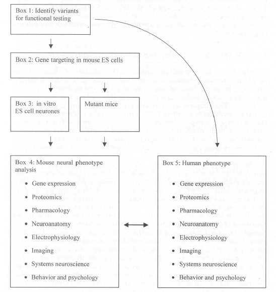 Layer 3 of the G2C is aimed at validating the biological significance of variant alleles found in humans. Here functional assays are required, and mouse ES cell technology again is used to provide several complementary in vivo and in vitro approaches. One could assemble a wide range of molecular and neuroscience methods in a highly interactive research program. These neurobiological studies can e linked to human neurobiological studies, thus providing a broad framework of connections at many levels of analysis.
