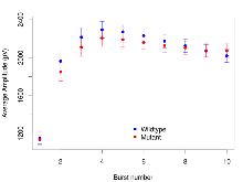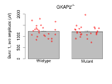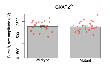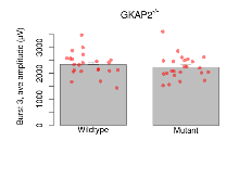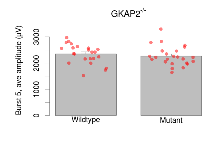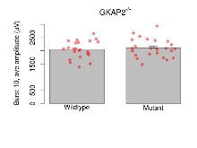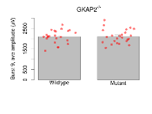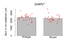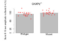 Mutant slices showed little overall electrophysiological difference from wildtype slices, with no electrophysiological variables significantly affected by this mutation. Note that in the theta burst analysis, the tenth burst is analysed as representative of individual burst amplitude.