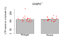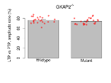 Variables shown are: LTP vs PTP, amplitude ratio, Reduction in potentiation from immediately after theta-burst stimulation to one hour later, fEPSP amplitude ratio. LTP based on amplitude, Long term potentiation, ratio of amplitudes of fEPSPs in test pathway and control pathway.