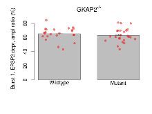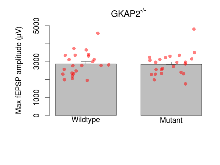 Birth of GKAP2-/- mice followed Mendelian ratios with 26% of offspring being homozygous knockouts. Genotypes of 3-week-old pups from GKAP2+/- intercrosses identified 22 wt, 57 GKAP2+/- and 28 GKAP2-/- progeny (Χ2 p= 0.568). Male and female GKAP2-/- mice developed normally to adulthood, exhibited normal body size and no gross abnormalities. GKAP2 mice were maintained by backcrossing onto the 129S5/SvEvBrd background; heterozygous males and females were fertile and used to set up intercrosses to generate homozygous and wildtype mice to study.