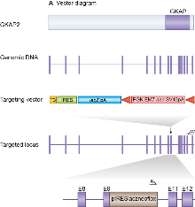 Genomic DNA was isolated from ES cells by Wizard SV 96 Genomic DNA purification system (Promega Cat A2371). Genotyping PCR consisted of a 180bp product amplified from the wild-type (wt) allele using a forward primer A (CTATCCTCCCTCACTCTGTTG) in the wt sequence deleted by targeted mutation and a reverse primer B (GCATCTTGATGTTCACACATC) downstream of the cassette. A 350bp product was amplified from the targeted allele using primer B with forward primer X, within the selection cassette. After enzymatic amplification for 35 cycles (45 seconds at 94 °C, 45 seconds at 55 °C, and 1 minute at 72 °C), the PCR products were size-fractionated on a 2% agarose gel in 1x Tris borate-EDTA buffer.
