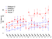 | RR naive fall time | log10 s | 0.85 (0.11) | 1.42 (0.06) | 1.31 (0.08) | 1.5 (0.07) | 0.02 * | 0.0036 ** |
