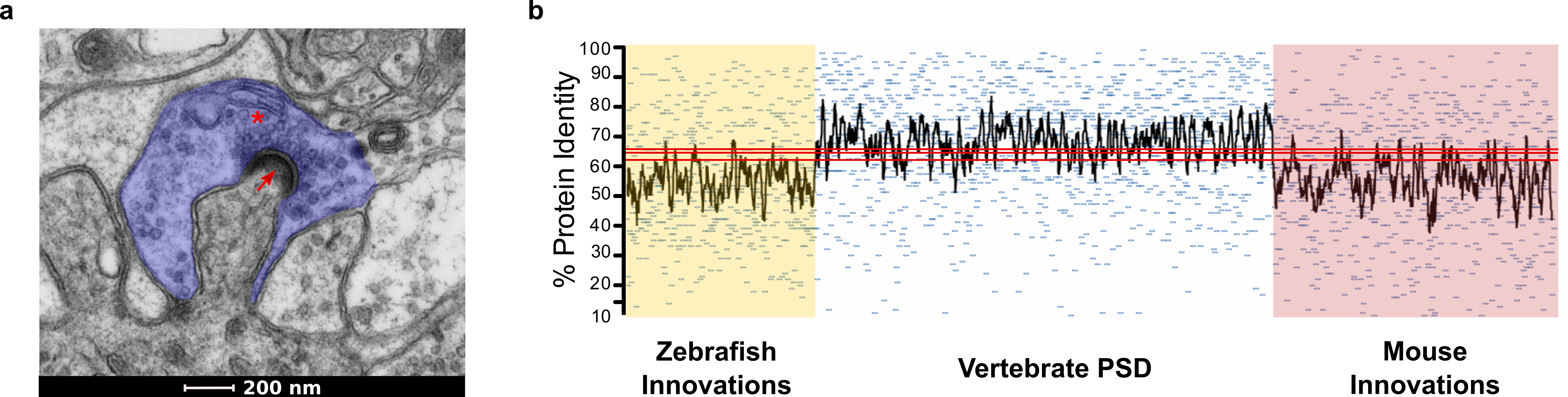 b. PSD protein sequence identity between mouse and zebrafish for proteins found in both species (vertebrate PSD)