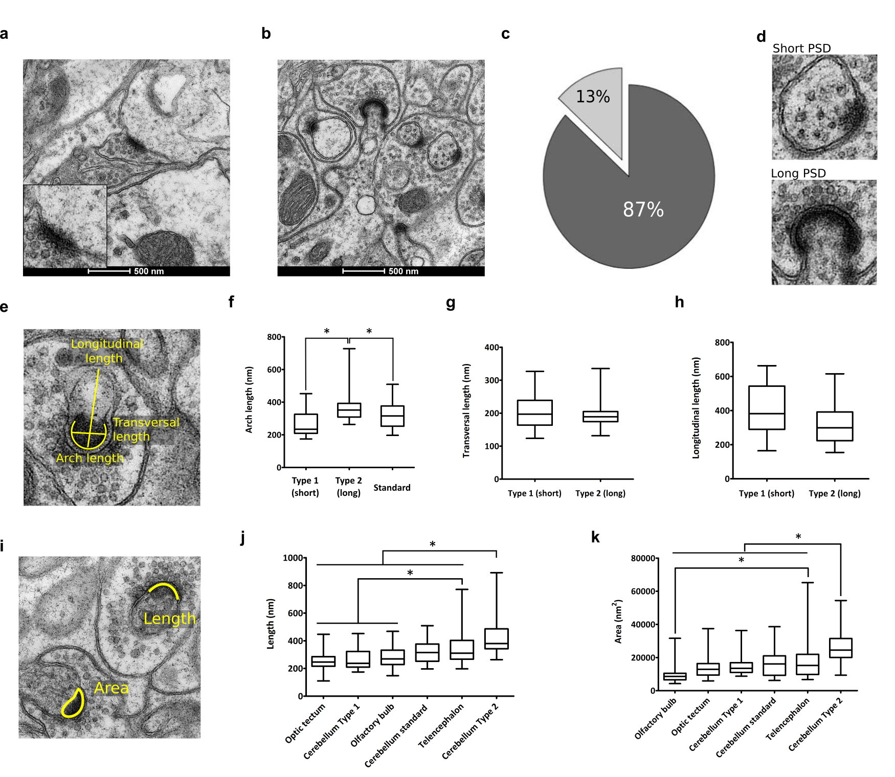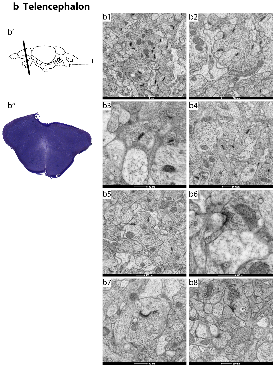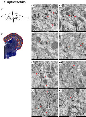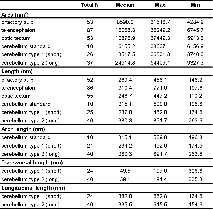 - Transmission electron microscopy of zebrafish asymmetric synapses in four different brain areas.