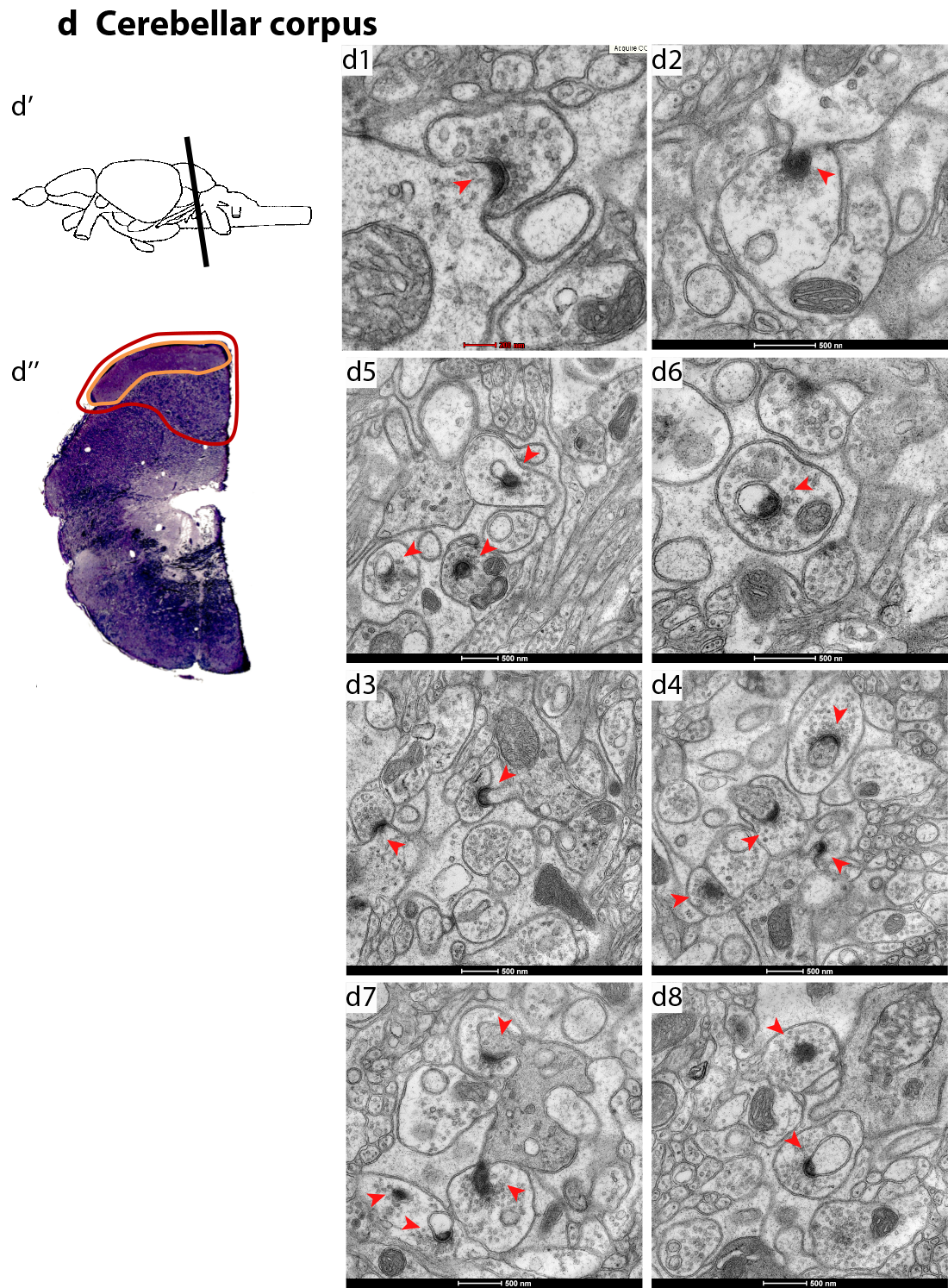 i. Micrograph displaying the morphology of most abundant asymmetric synapses from the cerebellar corpus. Red asterisks and arrows indicate the location of presynaptic vesicles and the PSD respectively. Scale bar 500 nm.