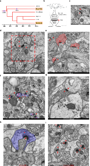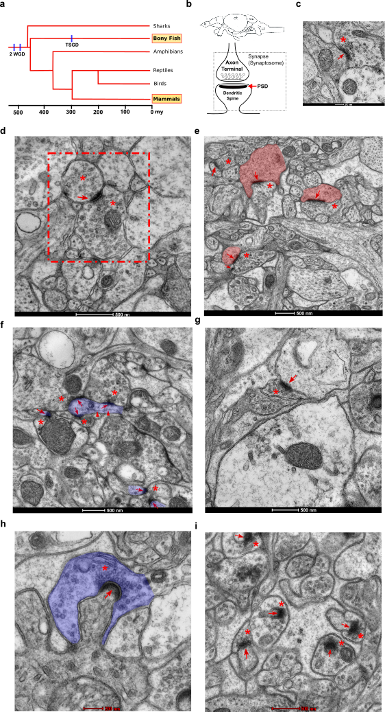f. Asymmetric synapses from the optic tectum. Red asterisks and arrows indicate the location of presynaptic vesicles and the PSD respectively. Red arrowheads indicate microtubule location within thin dendritic-like projection. The area of a thin dendritic-like projection, where synapses are form, is filled with purple. Scale bar 500 nm.