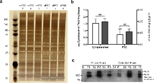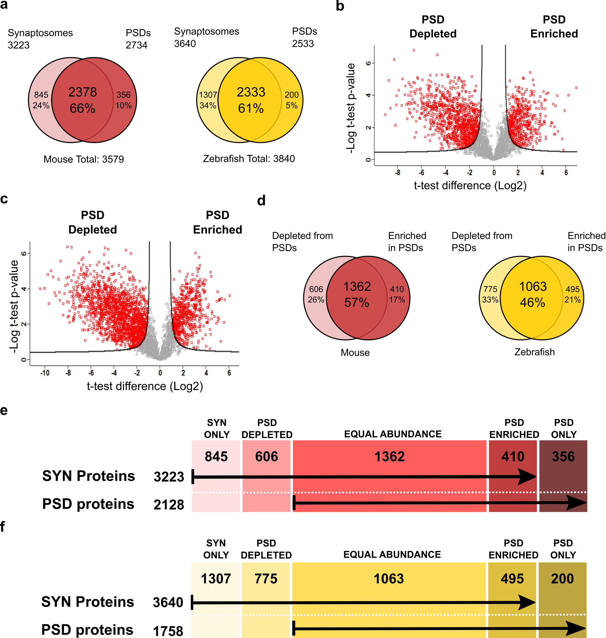 d. Venn diagrams of mouse (red) and zebrafish (yellow) proteins found depleted or enriched in the PSD when compared with the synaptosomal fraction. The percentage of proteins found with equal abundance at the synaptosomal and PSD fraction is also indicated.