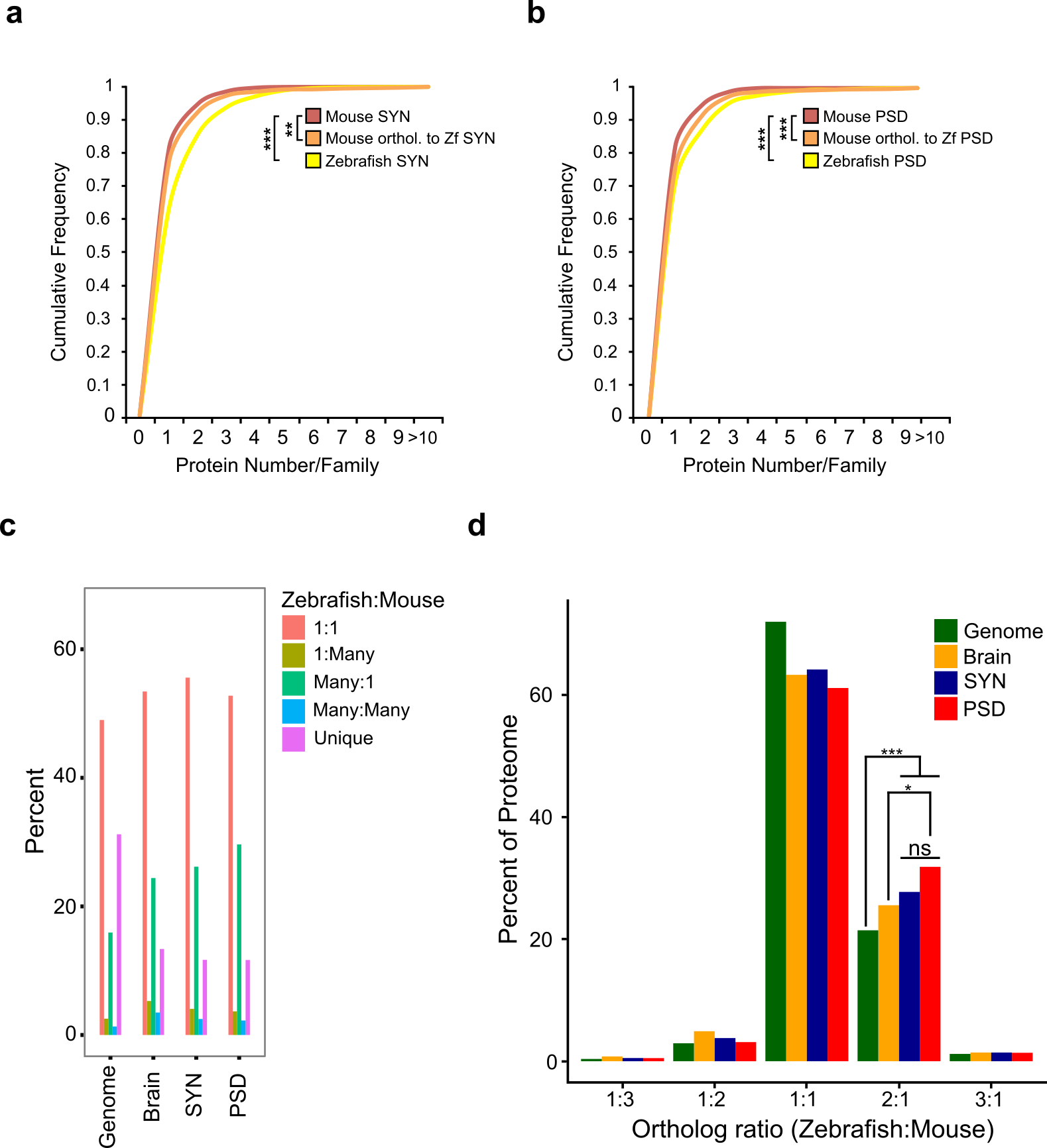 b. Cumulative frequency plot of proteins found per Ensemble Family amongst mouse, zebrafish and mouse orthologs of zebrafish PSD proteins. Kruskal-Wallis Test used to calculate significance between distributions (** p < 0.01 and *** p < 0.0001).