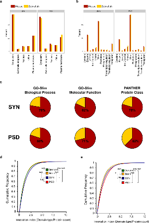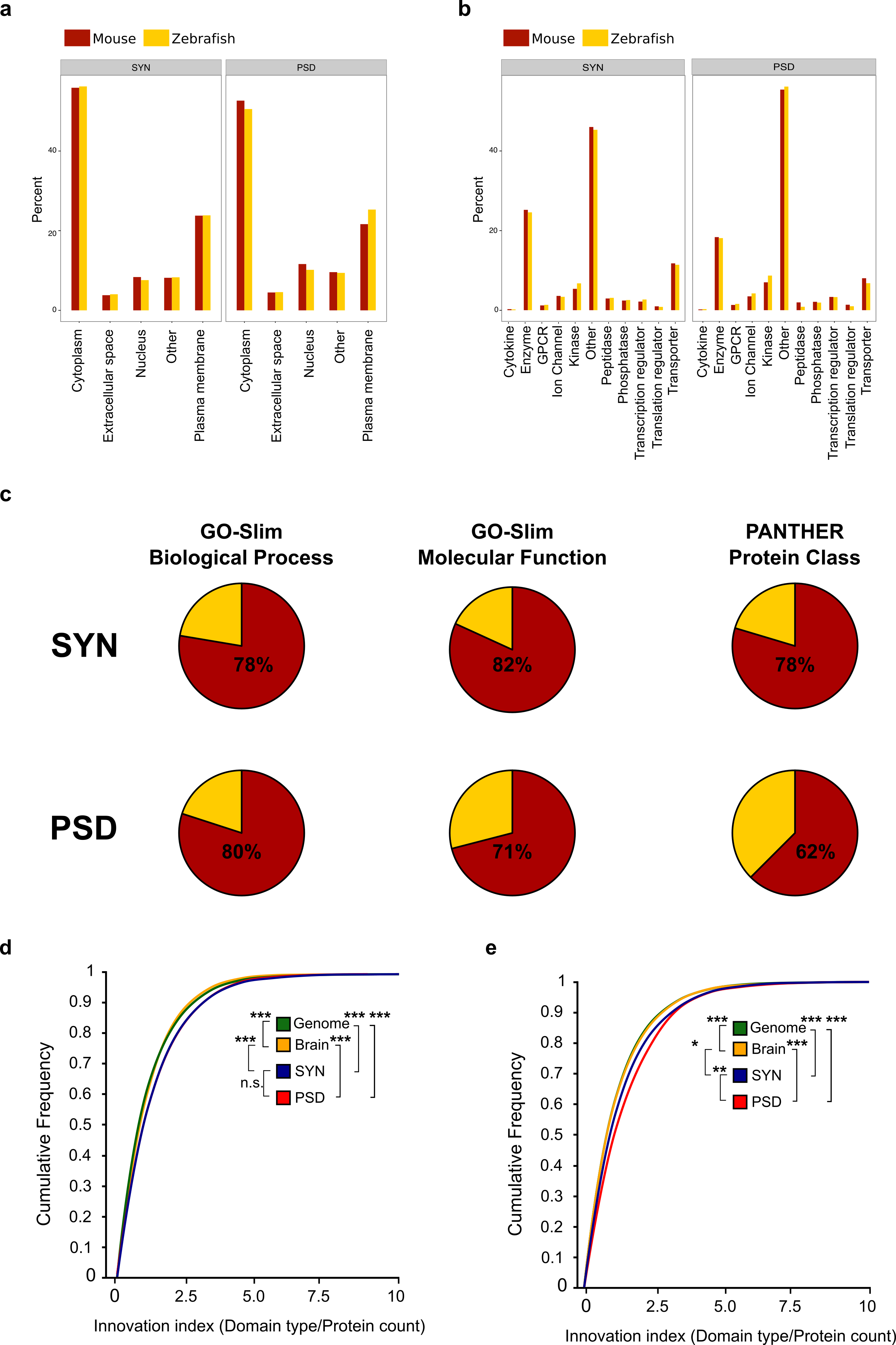 a. Fraction of mouse (red) and zebrafish (yellow) synaptic proteins annotated to IPA cell location categories.