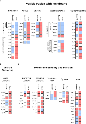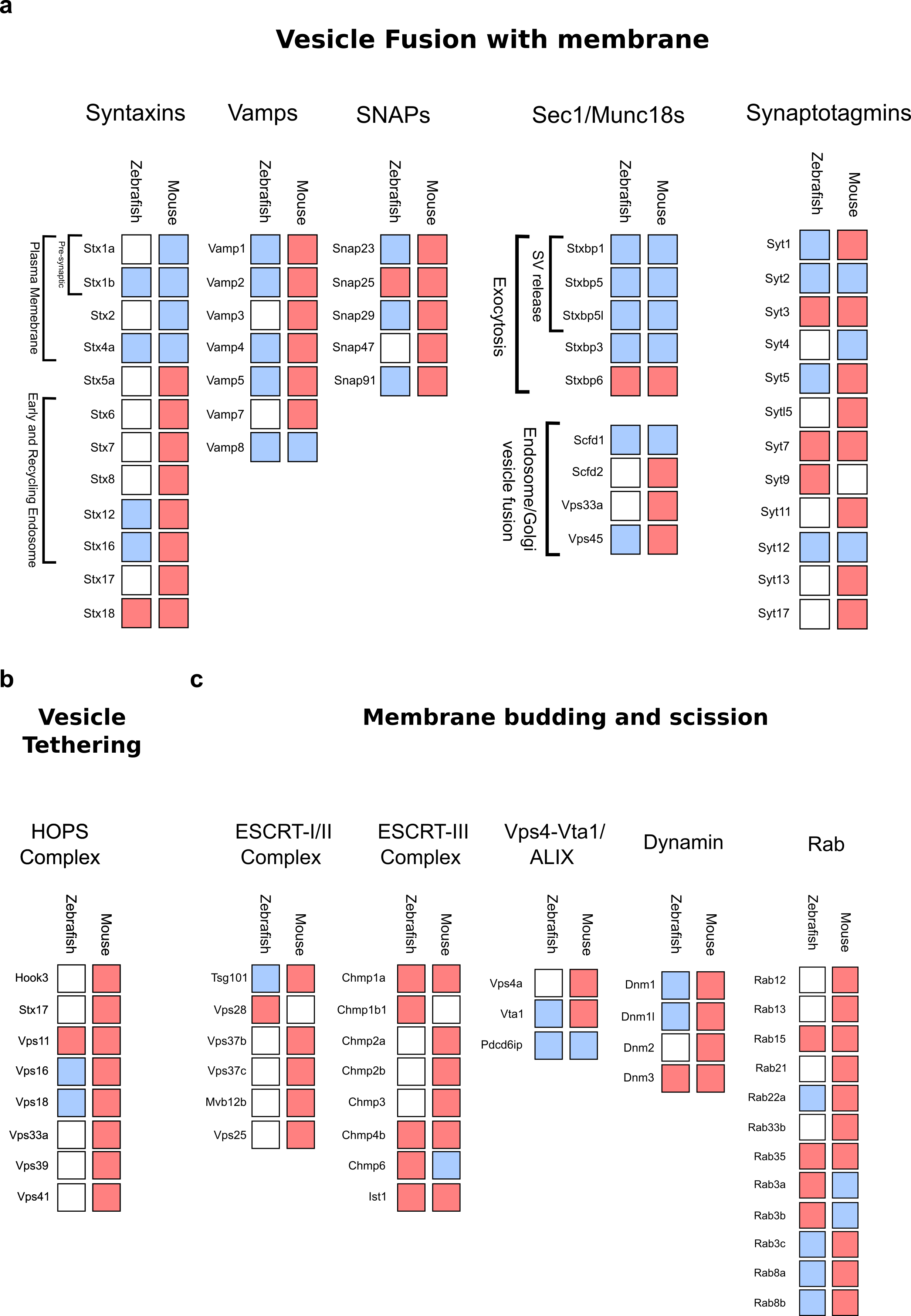 a. Proteins involved in vesicle fusion with membranes, including SNARE complex proteins: Syntaxins, Vamps and SNAPs, syntaxin binding proteins (Sec1/Munc18) and synaptotagmins.
