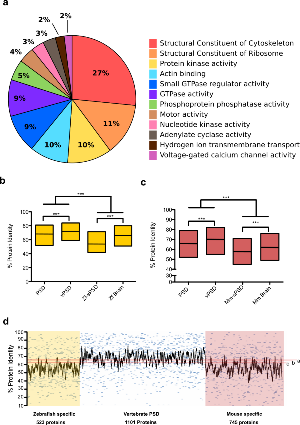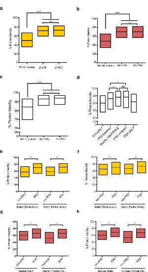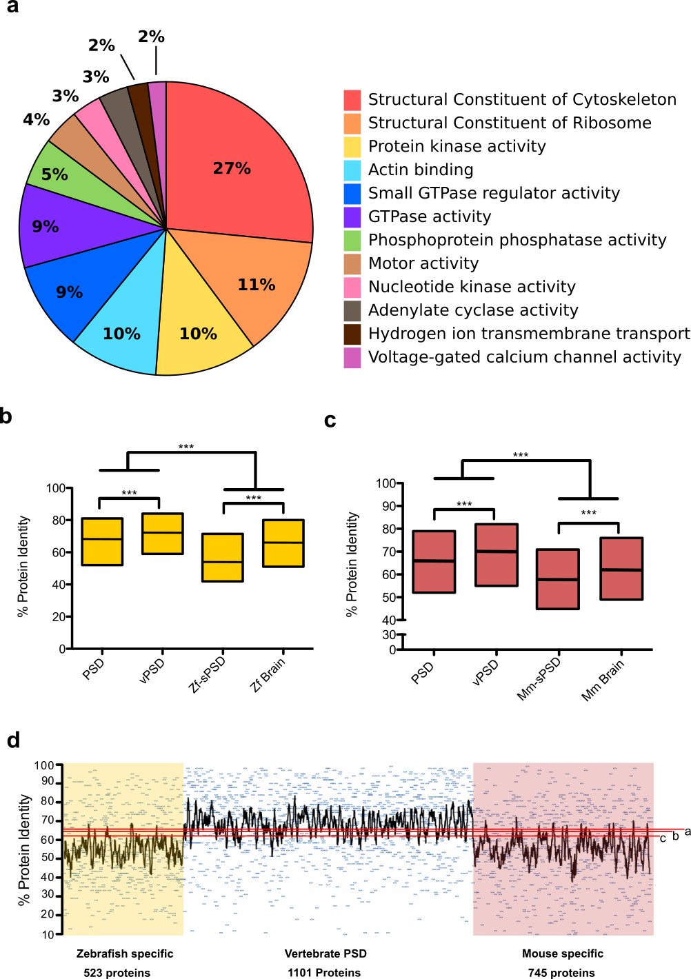 c. Box plots for the percentage of protein identity since the last common ancestor between zebrafish and mouse of mouse PSD proteins, PSD components found in both species (vPSD), mouse-specific PSD proteins (Mm-sPSD) and a mouse brain proteome. Distributions compared using the Mann-Whitney U test (*** p < 0.001).