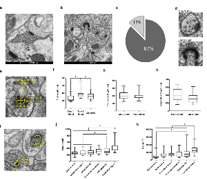 h. Asymmetric synapse from the medial part of the cerebellar corpus showing the extent at which the presynaptic element (highlighted in purple) surrounds the dendritic spine. Scale bar 200 nm.