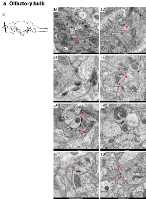 d. An asymmetric dendro-dendritic synapse of the olfactory bulb (framed by a red dotted square) is shown. Asterisks indicate pre- and post-synaptic vesicles. The PSD is indicated by a red arrow. Scale bar 500 nm.